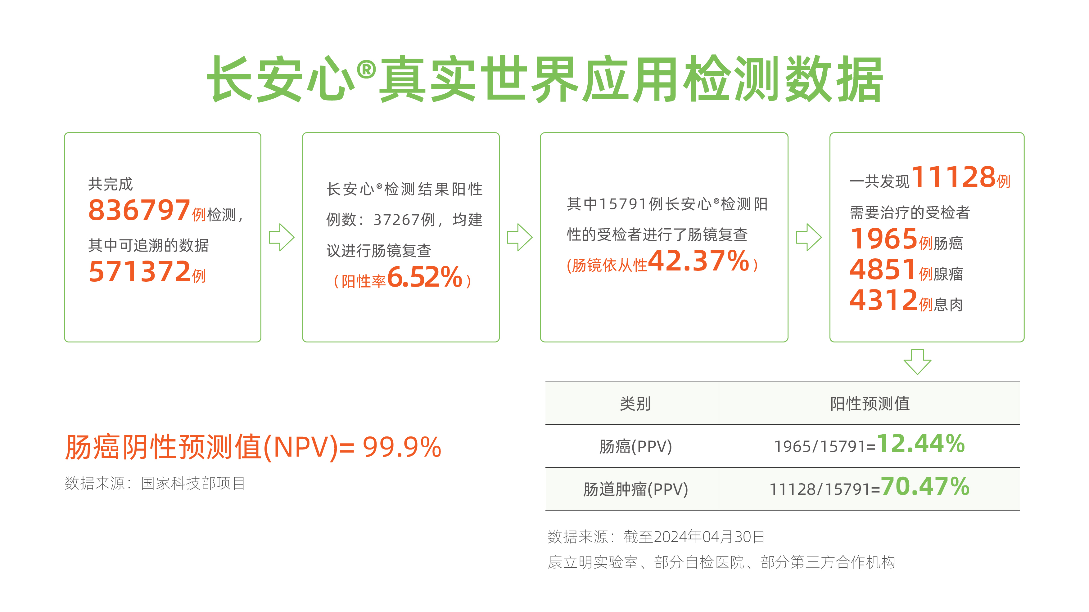 截至2024年4月30日,長(zhǎng)安心®共完成836797例檢測(cè),其中可追溯數(shù)據(jù)571372例。檢測(cè)結(jié)果陽(yáng)性37267例(陽(yáng)性率6.52%),均建議進(jìn)行腸鏡復(fù)查。其中,15791例檢測(cè)陽(yáng)性受檢者進(jìn)行了腸鏡復(fù)查(腸鏡依從性42.37%),共發(fā)現(xiàn)11128例需要治療的受檢者,其中腸癌1965例、腺瘤4851例、息肉4312例。長(zhǎng)安心®腸癌陽(yáng)性預(yù)測(cè)值(PPV)12.44%,腸道腫瘤陽(yáng)性預(yù)測(cè)值(PPV)70.47%,檢測(cè)性能優(yōu)異。