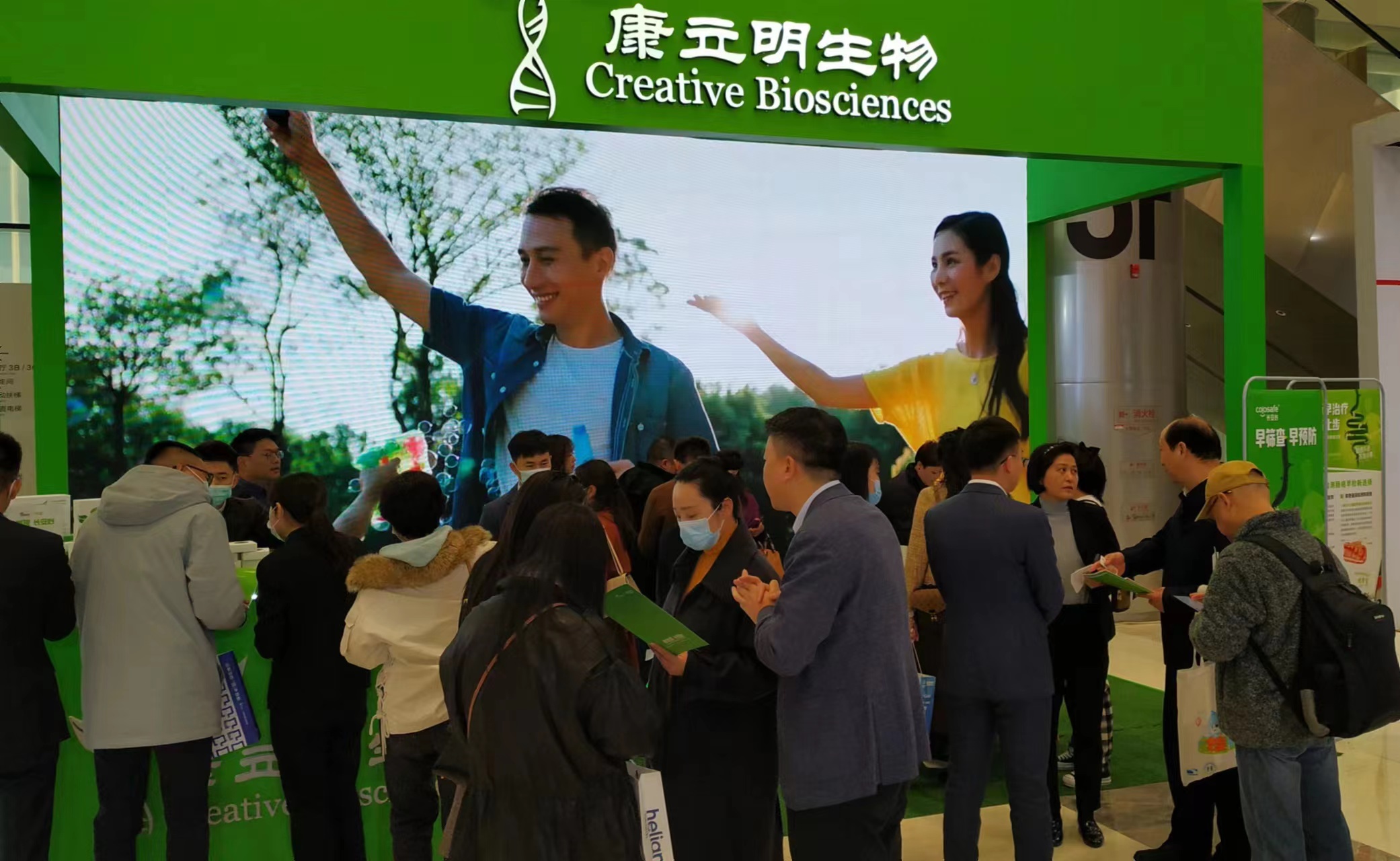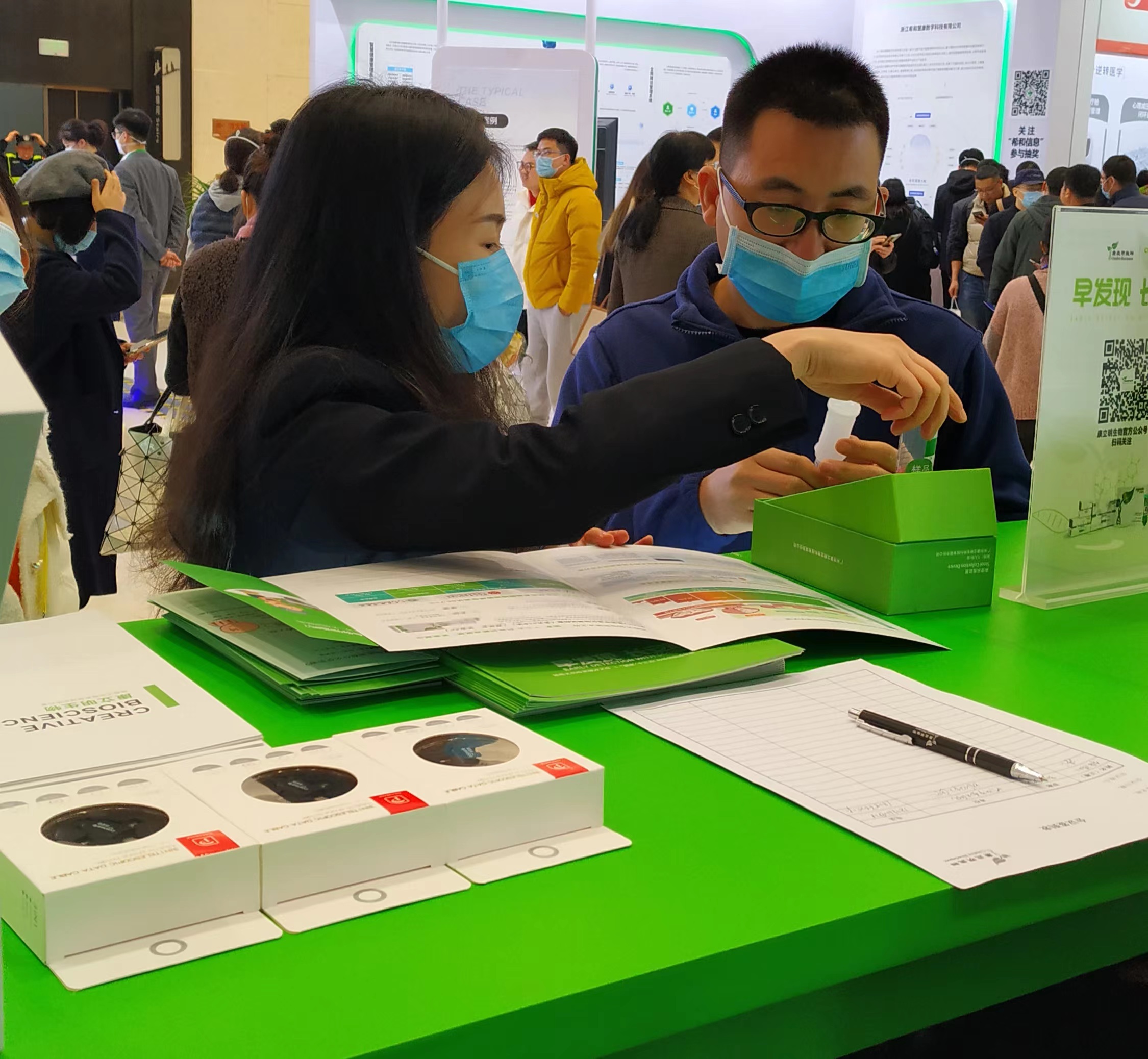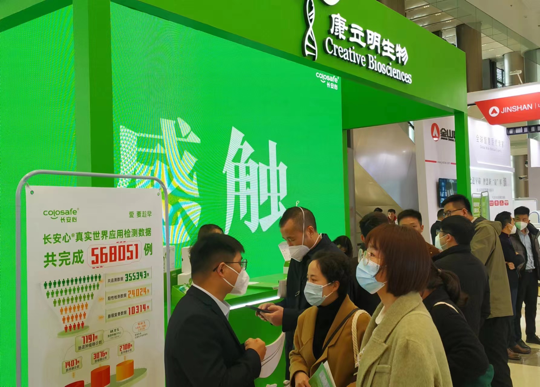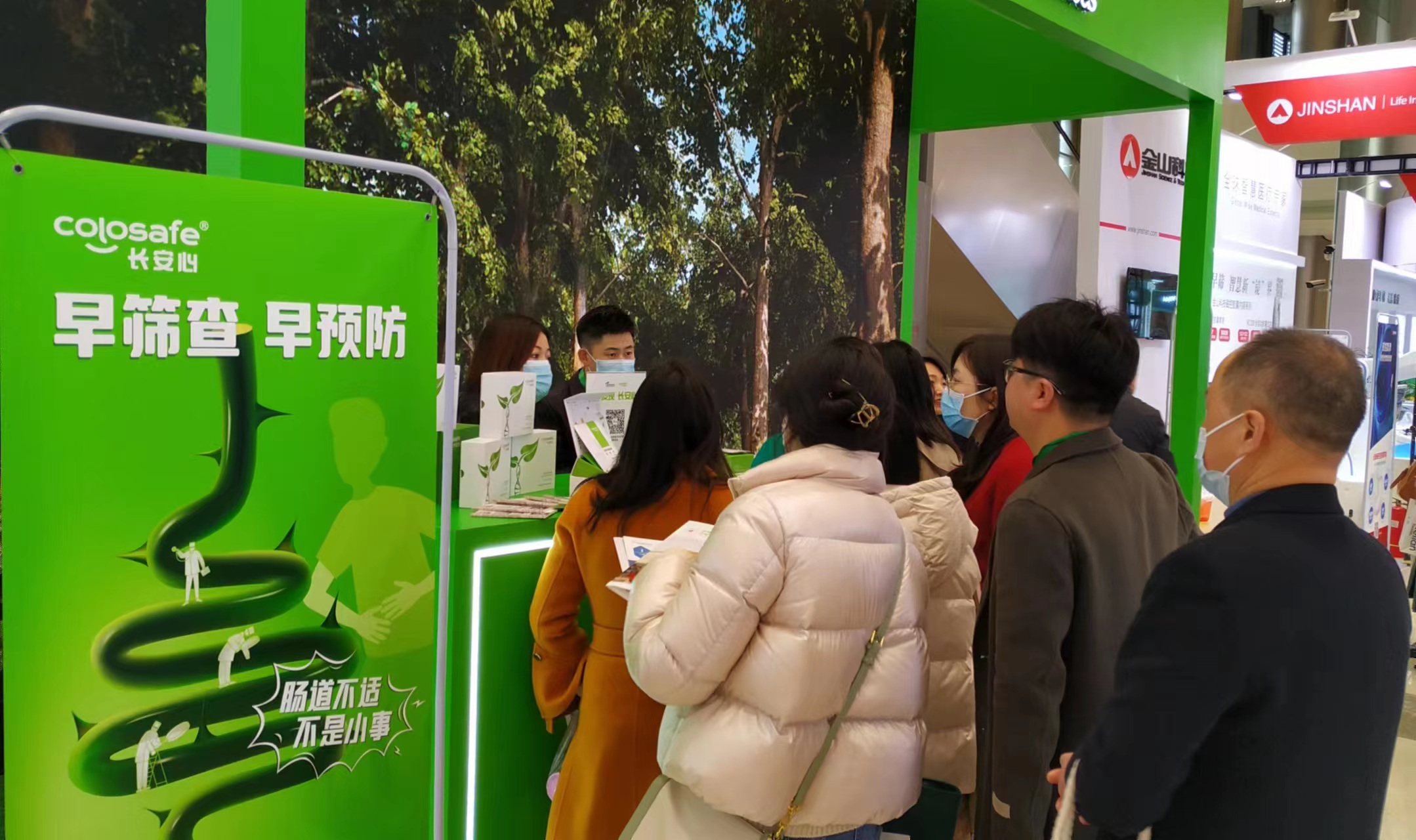 康立明生物攜長(zhǎng)安心®糞便DNA腸癌檢測(cè)產(chǎn)品參展??盗⒚魃镎刮灰源笞匀粸樵?,以代表生命和萬物生長(zhǎng)的綠色為抽象概念,構(gòu)建出一個(gè)Green Box,與現(xiàn)場(chǎng)展出的長(zhǎng)安心®小盒子,在形態(tài)到寓意上相呼應(yīng),吸引了眾多專家、嘉賓到康立明生物展位打卡、交流,探討長(zhǎng)安心®為健康管理系統(tǒng)提供的價(jià)值與成效。