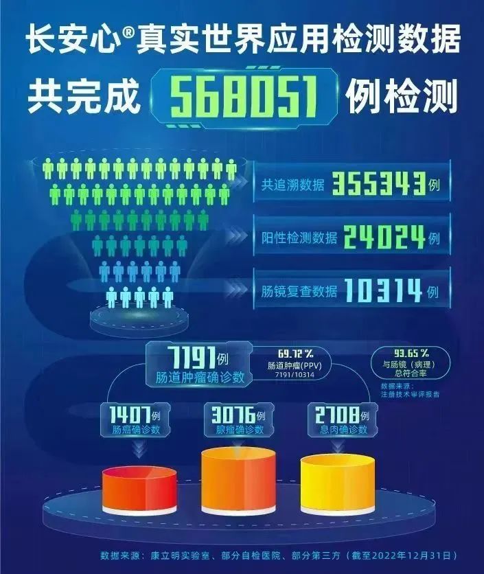 作為持續(xù)披露真實(shí)世界應(yīng)用數(shù)據(jù)的腸癌糞便基因檢測(cè)產(chǎn)品,截至2022年12月31日,長(zhǎng)安心®共完成568051例真實(shí)世界應(yīng)用檢測(cè),其中355343例應(yīng)用數(shù)據(jù)可追溯,24024例受檢者長(zhǎng)安心檢測(cè)結(jié)果陽性(陽性率6.76%),其中10314例陽性檢測(cè)結(jié)果的受檢者進(jìn)行了腸鏡復(fù)查(腸鏡依從性42.93%),有7191例受檢者確診腸道腫瘤,其中1407例腸癌,3076例腺瘤,2708例息肉。