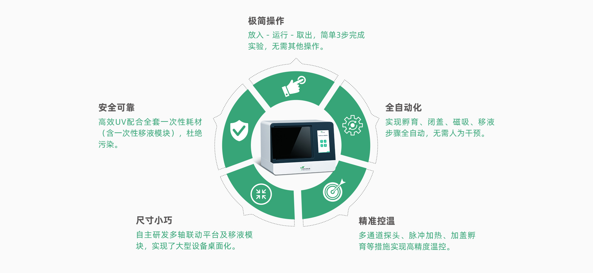 全自動(dòng)核酸提取儀H24采用了自主研發(fā)的移液模塊、孵育模塊,通過磁珠法全自動(dòng)實(shí)現(xiàn)大體積復(fù)雜樣本基因組DNA的提取、富集、轉(zhuǎn)化、純化過程,解決了復(fù)雜樣本高質(zhì)量核酸自動(dòng)化提取轉(zhuǎn)化難題。設(shè)備采用多軸聯(lián)動(dòng)的自動(dòng)化平臺(tái),配合獨(dú)創(chuàng)的移液模塊,極大地縮小了移液平臺(tái)尺寸,同時(shí)提高了設(shè)備運(yùn)轉(zhuǎn)效率。